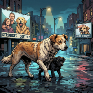 They stayed in the alleys and side streets. Flora told Sherlock to stay close. “You never know when we might have to run.” She didn’t answer when he asked why. They passed billboards with slogans like “Hands and Paws United” with a picture of a human and a dog embracing. Another sign advertised a dog food brand promising to “Keep your little buddy mellow.” It made Flora want to eat grass just so she could throw up.